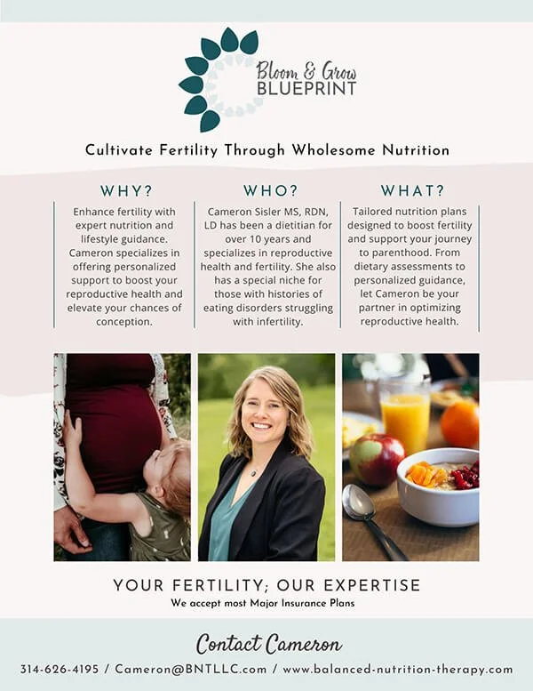 Printable Resources for Balanced Nutrition Therapy Programs Click any item to view the full, printable document. Eating Disorder Information Pediatric Eating Disorders Postcard Everyday Recovery Brochure Everyday Recovery Postcard All BNT Services Flyer Fertility Information Bloom & Grow Masterclass Postcard Bloom & Grow Blueprint Flyer Fertility Nutrition Postcard Fertility Nutrition Brochure Balanced Nutrition Therapy Resources | (636) 686-0682